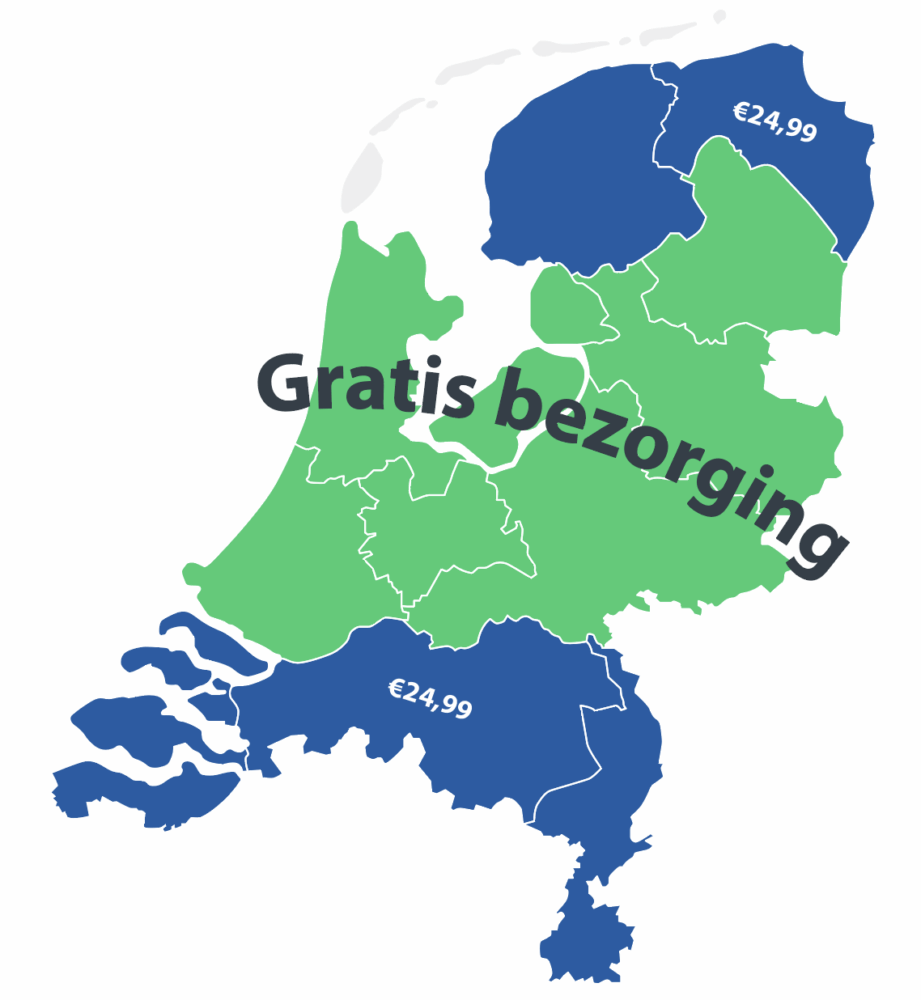 Ja, onze bezorging is volledig gratis binnen Noord-Holland, Zuid-Holland, Utrecht, Flevoland, Gelderland, Overijssel en Drenthe. Daarbuiten geldt een vast tarief van €24,99.