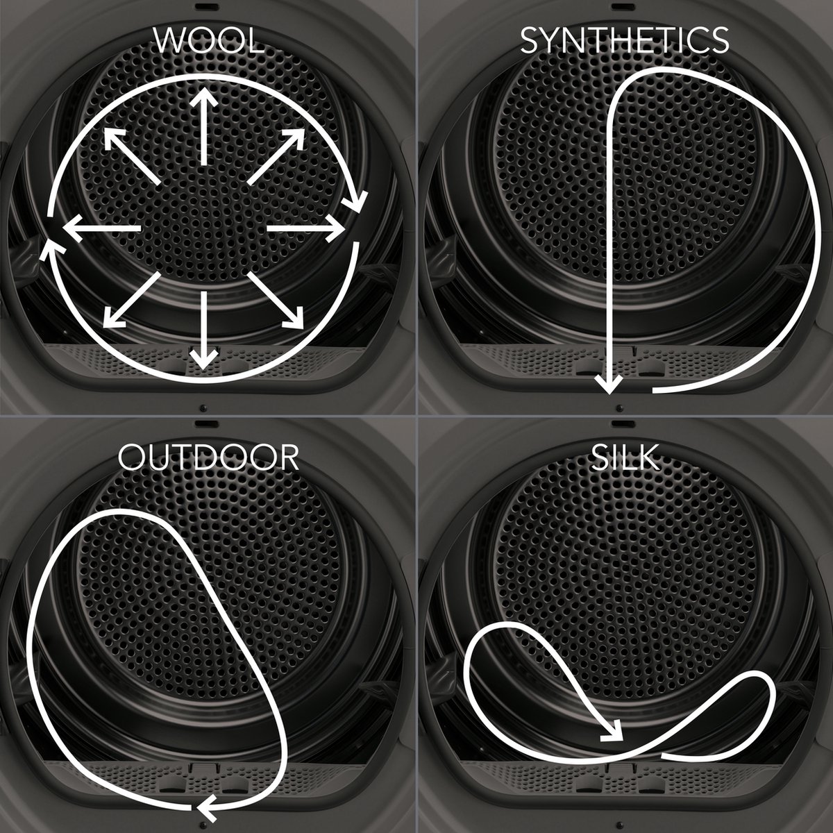 | Droogprogramma’s | Katoen, synthetisch, wol, zijde, outdoor, en meer |