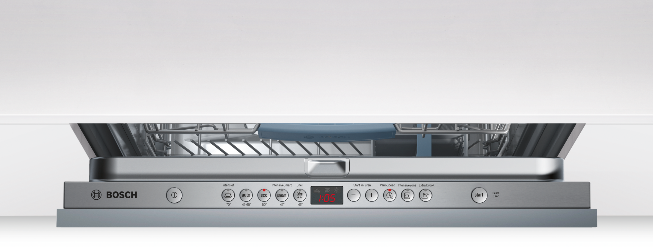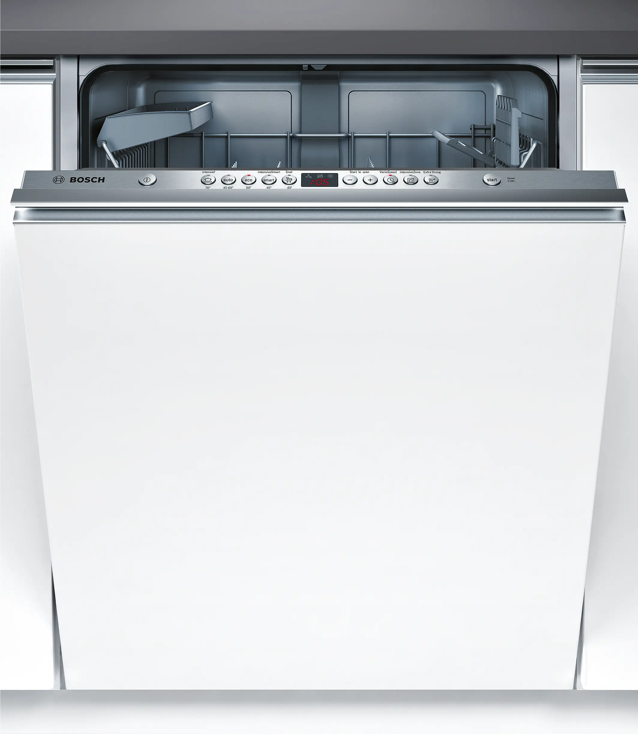 De Bosch SMV93M10NL vaatwasser beschikt over Auto-, Eco-, intensief- en snelle programma’s, zodat je altijd het juiste programma kiest voor jouw vaat. Extra functies zoals VarioSpeed en IntensiveZone zorgen voor sneller reinigen of extra krachtige reiniging van sterk vervuilde vaat.