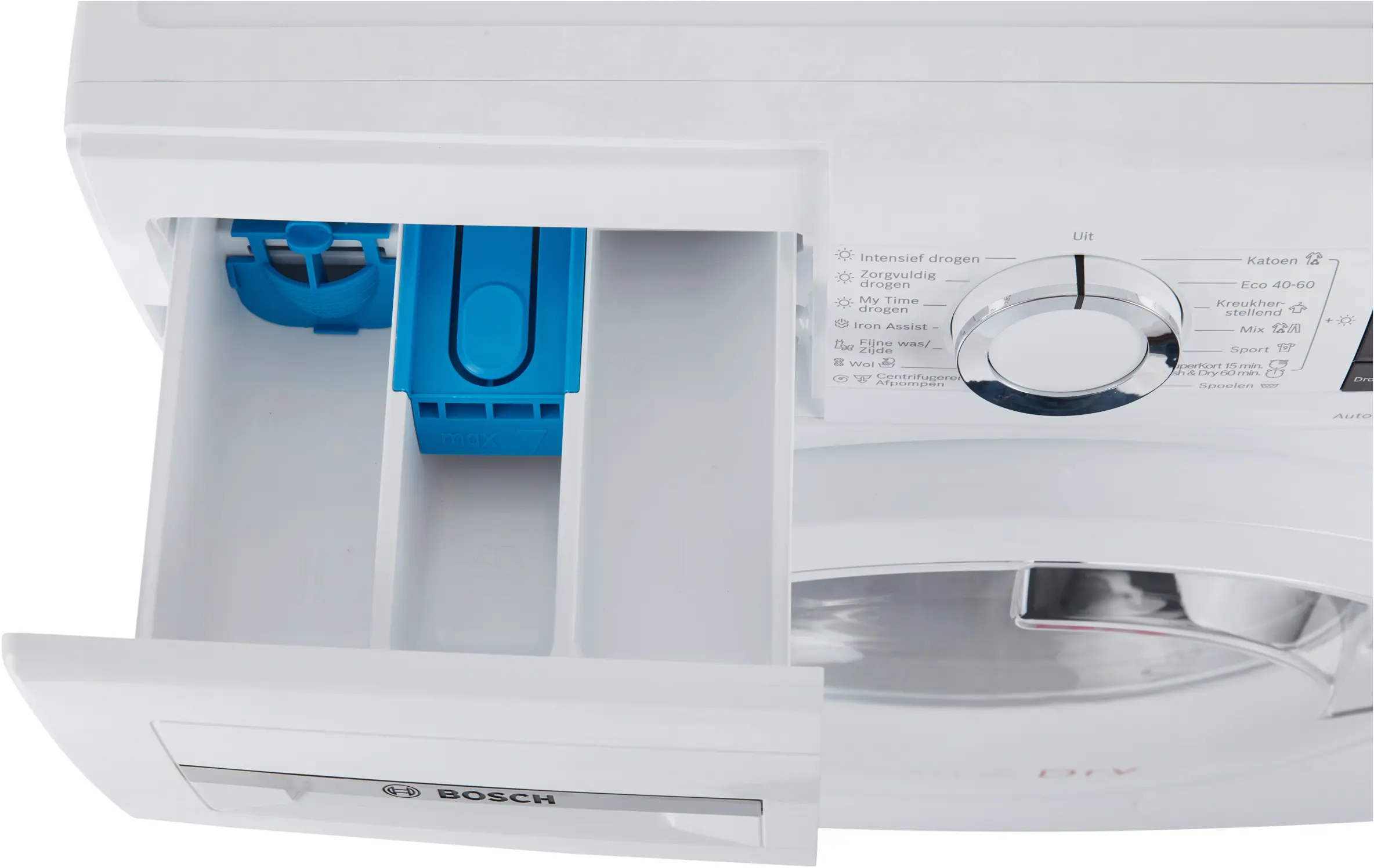 De Bosch WNA13490NL was-droogcombinatie is eenvoudig te bedienen via de draaiknop en het display. Functies zoals startuitstel en resttijdindicatie geven je extra controle over het programma.