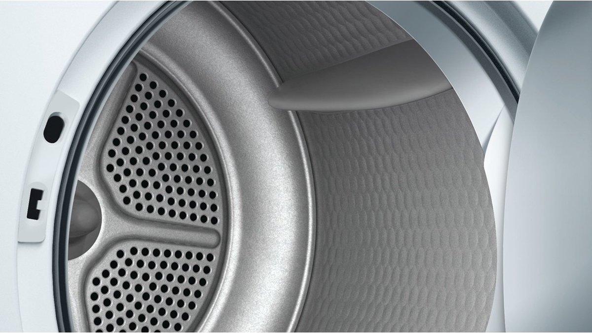 De droger is uitgerust met AutoDry-sensoren die continu het vochtgehalte van het wasgoed meten. Hierdoor stopt het programma automatisch zodra de gewenste droogtegraad is bereikt. Dit voorkomt krimpen en onnodige slijtage van kleding. Het SensitiveDrying System zorgt voor een gelijkmatige luchtverdeling in de trommel, waardoor wasgoed zacht en kreukarm wordt gedroogd.