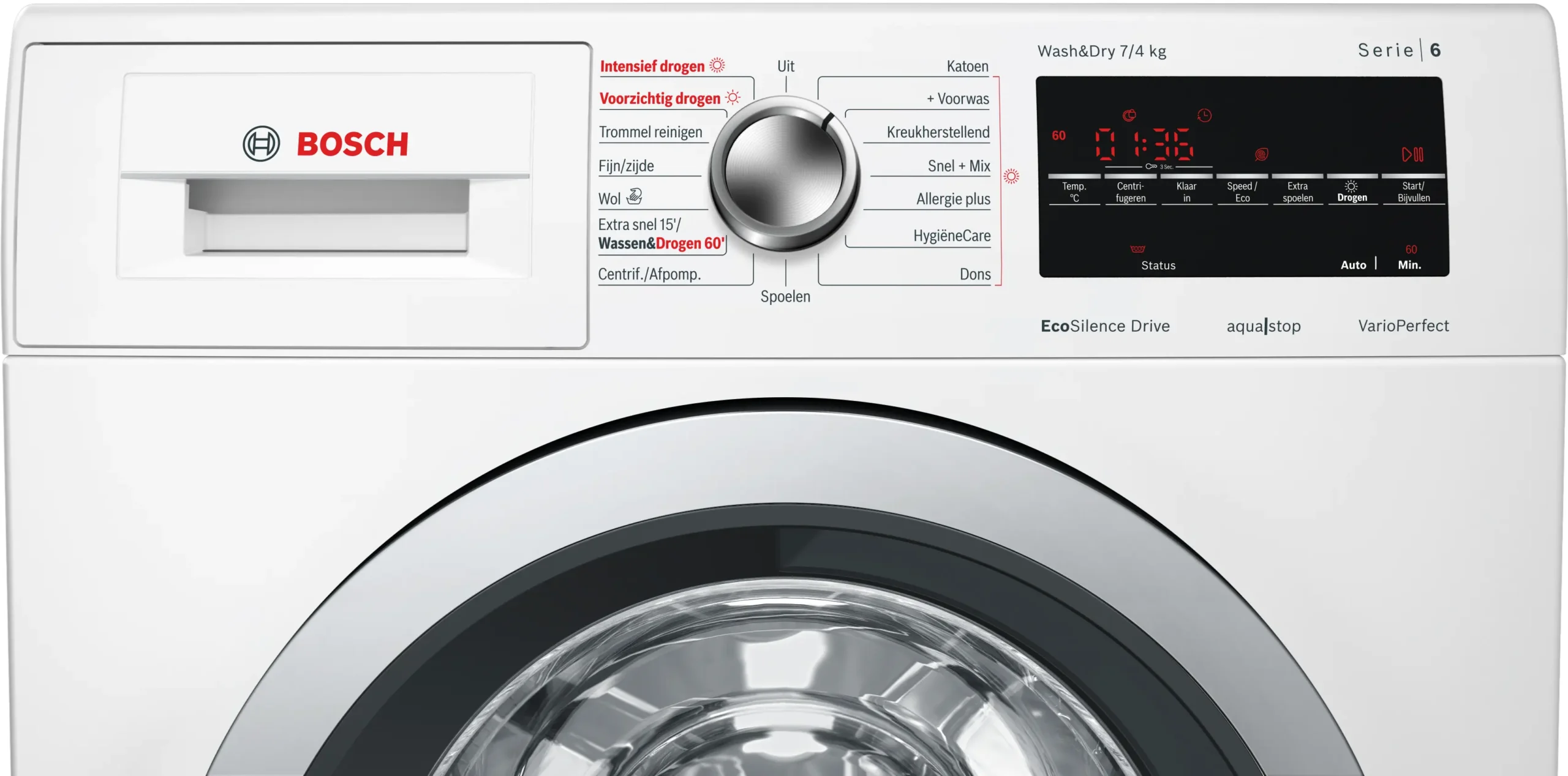 De Bosch WVG30442 was-droogcombinatie beschikt over overzichtelijke bediening, startuitstel en resttijdindicatie voor extra gemak.
