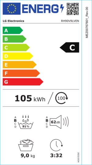 LG RH90V9LVEN wasdroger – 9 kg, C, Dual inverter heatpump, 62 dBA, 14 programma’s