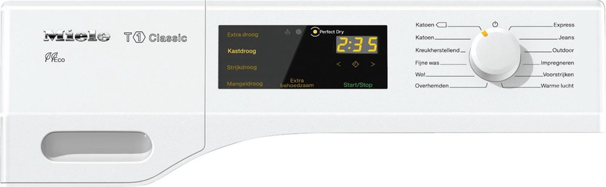 De Miele TDB130WP warmtepompdroger beschikt daarnaast over PerfectDry-technologie, die het vochtgehalte nauwkeurig meet en het programma automatisch stopt zodra de gewenste droogtegraad is bereikt. Dit voorkomt overdrogen en beschermt je kleding tegen slijtage.