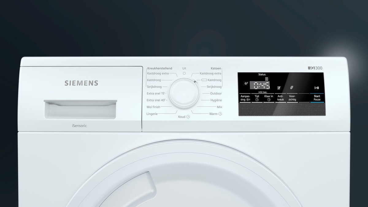 Deze Siemens condensdroger heeft een droogprogramma waarmee je wasgoed in slechts 40 minuten kunt drogen. Het superKort40-programma heeft een optimaal temperatuurverloop en een speciale koelfase. Ideaal wanneer je een shirtje nog snel wilt drogen, voordat je de deur uit gaat.