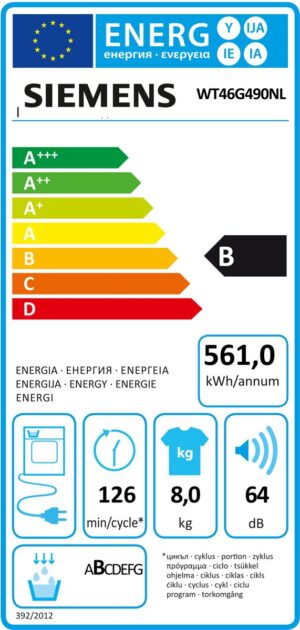 Extra gebruiksgemak bieden functies zoals trommelverlichting, resttijdindicatie en uitgestelde start. De Siemens WT46G490NL is een robuuste en gebruiksvriendelijke condensdroger voor dagelijks gemak.