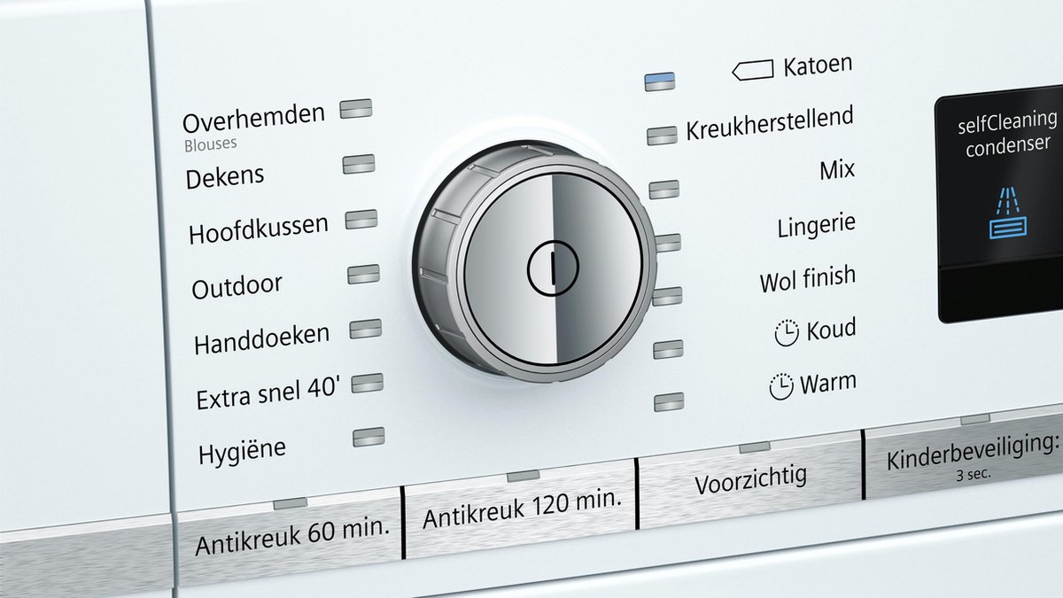 Uniek aan dit model is de selfCleaning condenser, die automatisch de condensor reinigt zonder dat je hier veel onderhoud aan hebt. Dit zorgt voor blijvende efficiëntie en een optimaal droogresultaat. Met het overzichtelijke LED-display, handige droogprogramma’s en extra functies biedt de Siemens WT47W5E7NL iQ700 een complete droogoplossing voor dagelijks gebruik.